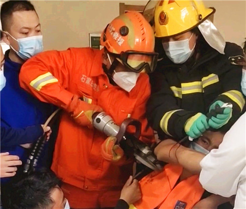 15时29分,消防救援人员到达现场,消防员与医生进行充分沟通后,决定对贯穿右臂的钢筋进行切割,根据现场情况,在确保手术方便,同时不给伤者造成二次伤害的情况下,消防救援人员迅速连接剪切钳,启动液压机动泵,骨伤科主任牛朝旭、副主任韩利峰等医护从旁协助,大约10分钟后,钢筋被顺利切割下来,医院立即对伤者实施救治。