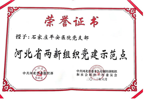 在庆祝中国共产党成立102周年之际,为激励先进、创先争优、树立典型,推动两新党组织全面进步、全面过硬,河北省委组织部、省委两新工委授予石家庄平安医院党支部等党组织为“河北省两新组织党建示范点”。